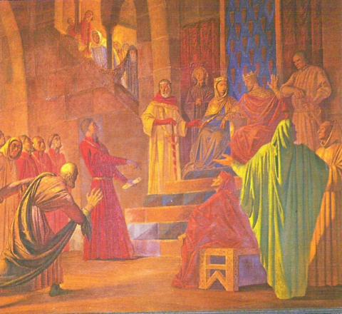 Encontrándose el rey en Valencia en 1333 , justo el mismo año que fallece el personaje misterioso, allá se dirige éste para hacerle ver el error en que ha caído. El rey se retracta y anula su decisión, pero ay! la castellana, la cual no actúa igual pues ve debilidad en su marido, afirma airada ante todos que si esto estuviese en manos del rey de Castilla, su hermano Alfonso XI, les habría cortado la cabeza a todos en un santiamén. Cómo reacciona el rey Alfonso? Contesta: «Reina, reina!, el nostre poble és franc e no és així subjugat com és lo poble de Castella, car ells tenen a Nós com a Senyor e Nós a ells com a bons vassalls e companyons» (reina, reina, nuestro pueblo es libre, y no está sojuzgado como el pueblo de Castilla, porque ellos me tienen a mí como a Señor y nosotros a ellos como buenos vasallos y compañeros). Y adiós muy buenas. Tema cerrado. Lo más cinematográfico de esta historia es que se cree que nuestro hombre pudo haber apostado hombres por diferentes partes de la ciudad que se habrían puesto a su servicio si el rey no hubiese dado su brazo a torcer…y quién sabe cómo habría acabado esto.
